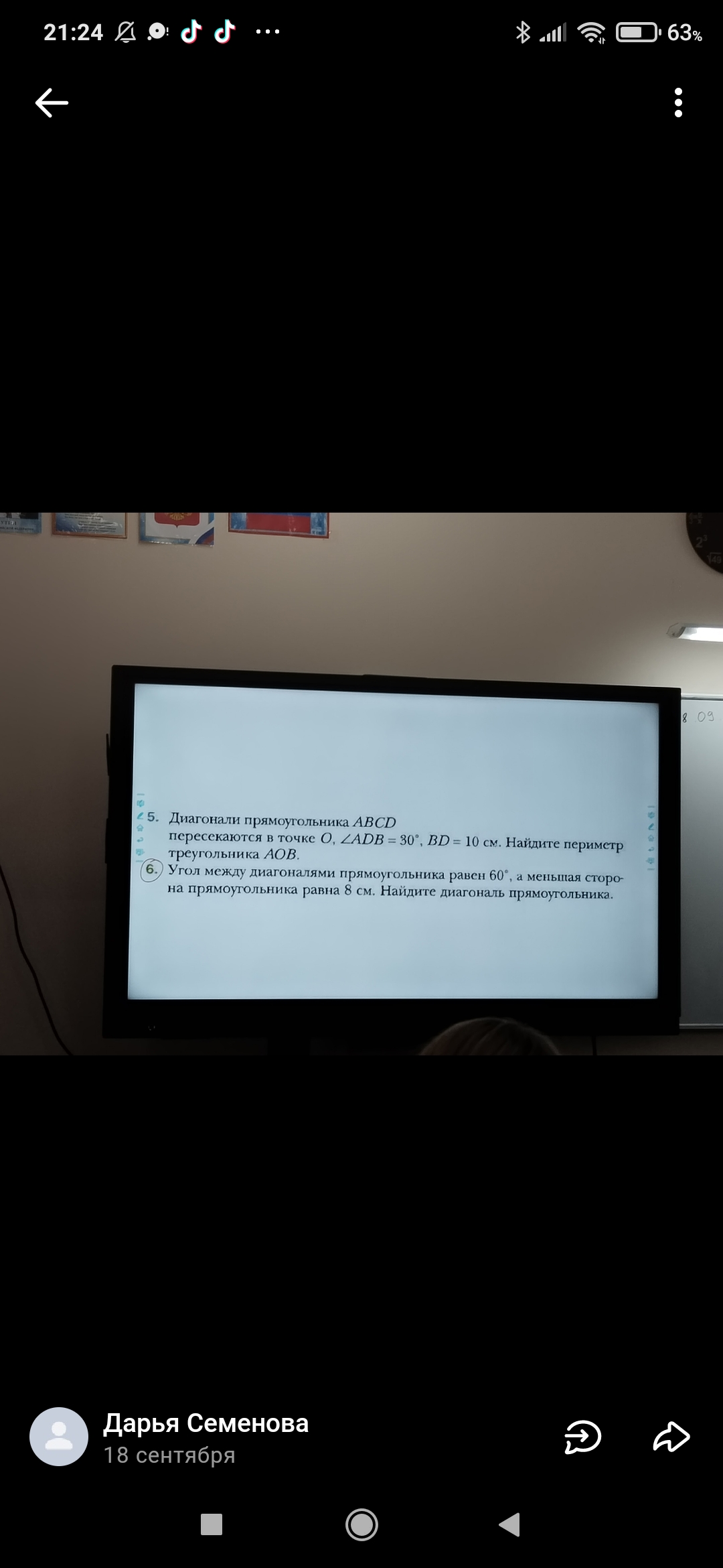 Рассмотрим прямоугольник ABCD, где AB - меньшая сторона, равная 8 см. Пусть O - точка пересечения диагоналей. Угол между диагоналями ∠AOB = 60°. Так как диагонали прямоугольника равны и точкой пересечения делятся пополам, то AO = OB, и треугольник AOB - равнобедренный. Поскольку ∠AOB = 60°, то и углы при основании AB тоже равны 60°, то есть ∠OAB = ∠OBA = 60°. Следовательно, треугольник AOB - равносторонний, и AO = OB = AB = 8 см.