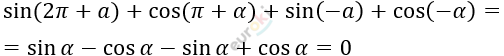 Упростите выражение: sin(2π+a)+cos(π+a)+sin(-a)+cos(-a).