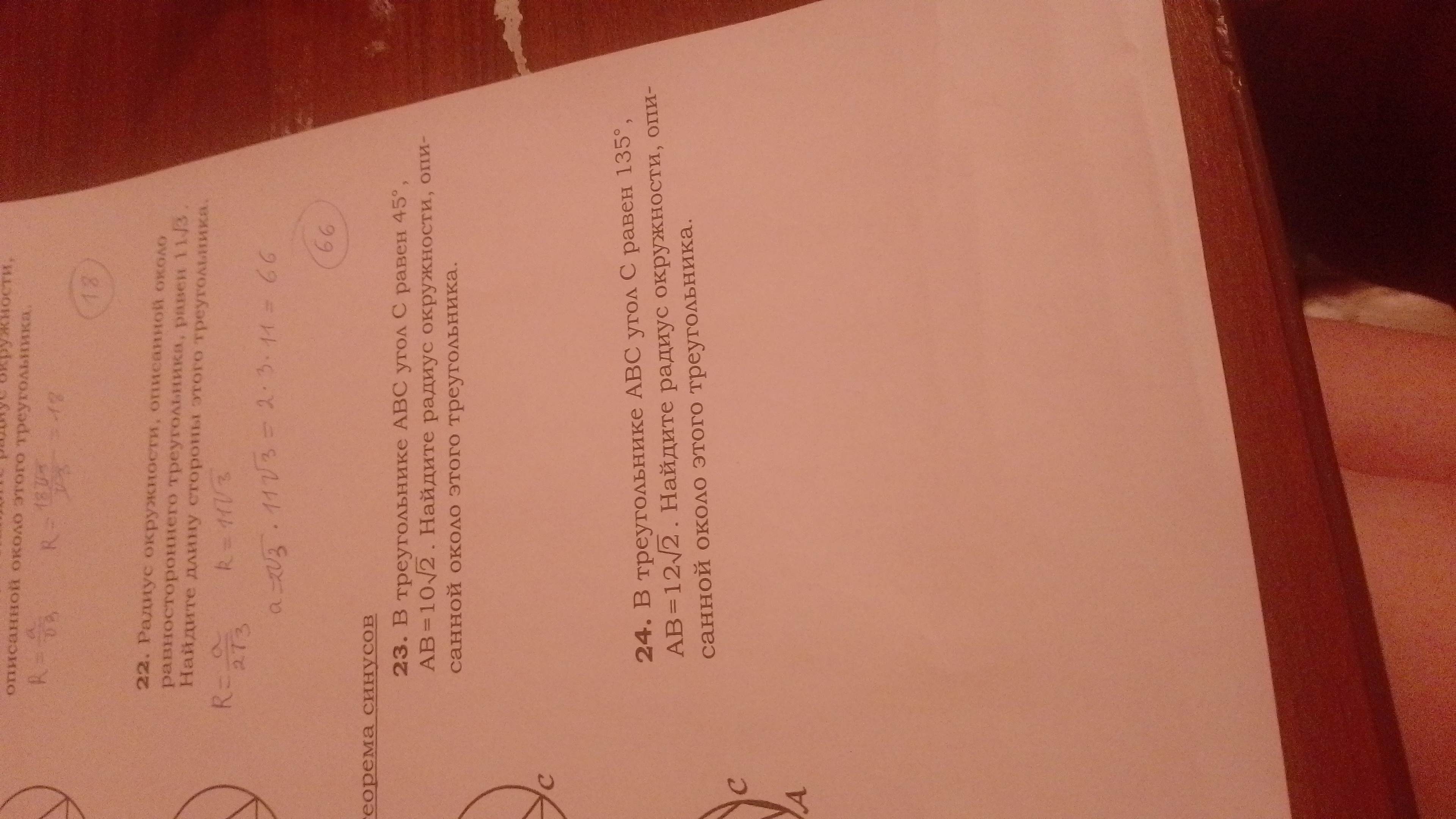 По теореме синусов, \( \frac{AB}{\sin{C}} = 2R \), где \( R \) - радиус описанной окружности. Дано \( AB = 12\sqrt{2} \) и \( C = 135^\circ \). \( \sin{135^\circ} = \sin{(180^\circ - 45^\circ)} = \sin{45^\circ} = \frac{\sqrt{2}}{2} \). Подставим известные значения в формулу:
