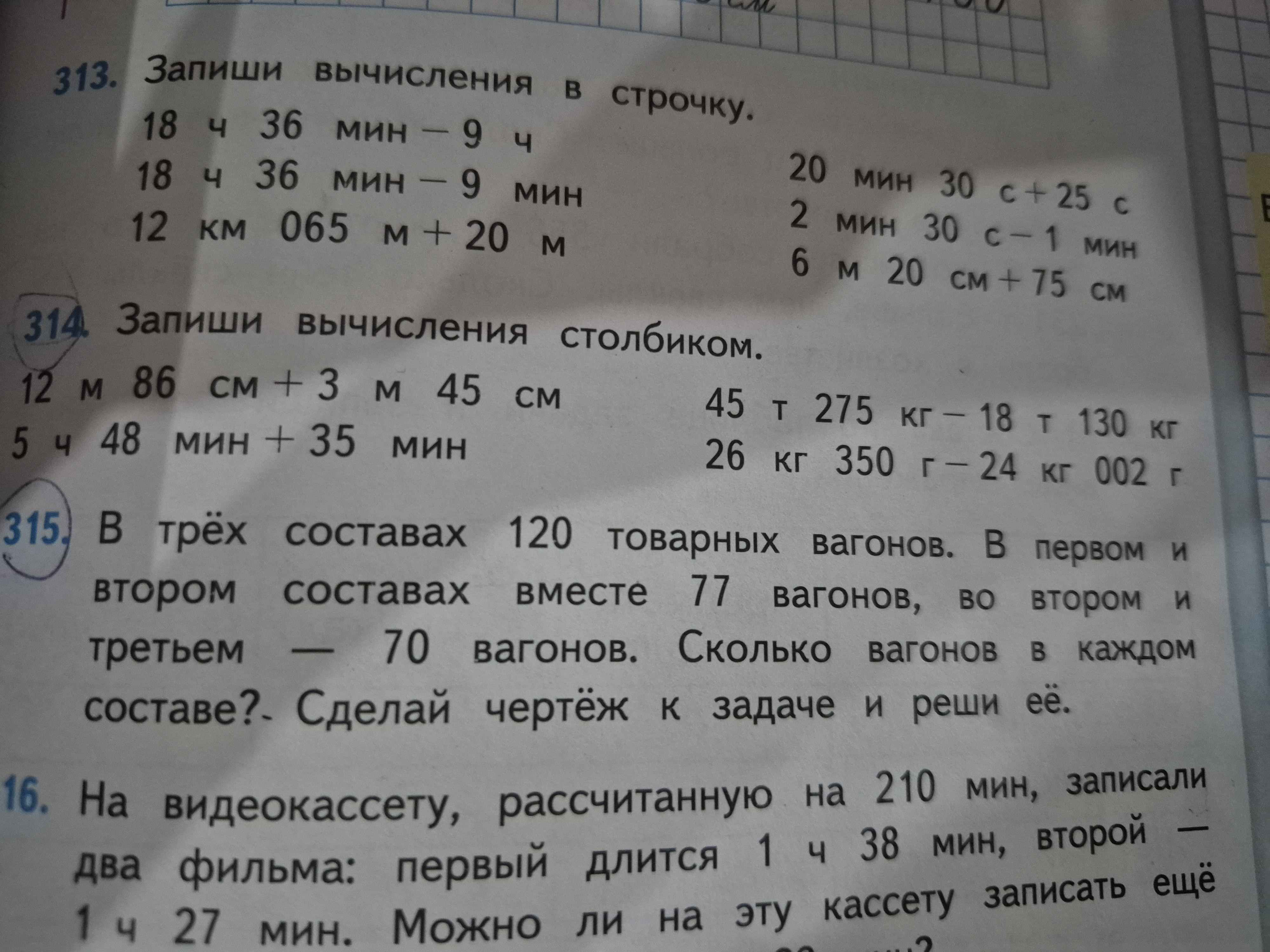 $$ egin{cases} x + y + z = 120 \ x + y = 77 \ y + z = 70 end{cases} $$Ответ: в первом составе 50 вагонов, во втором 27 вагонов, в третьем 43 вагона.