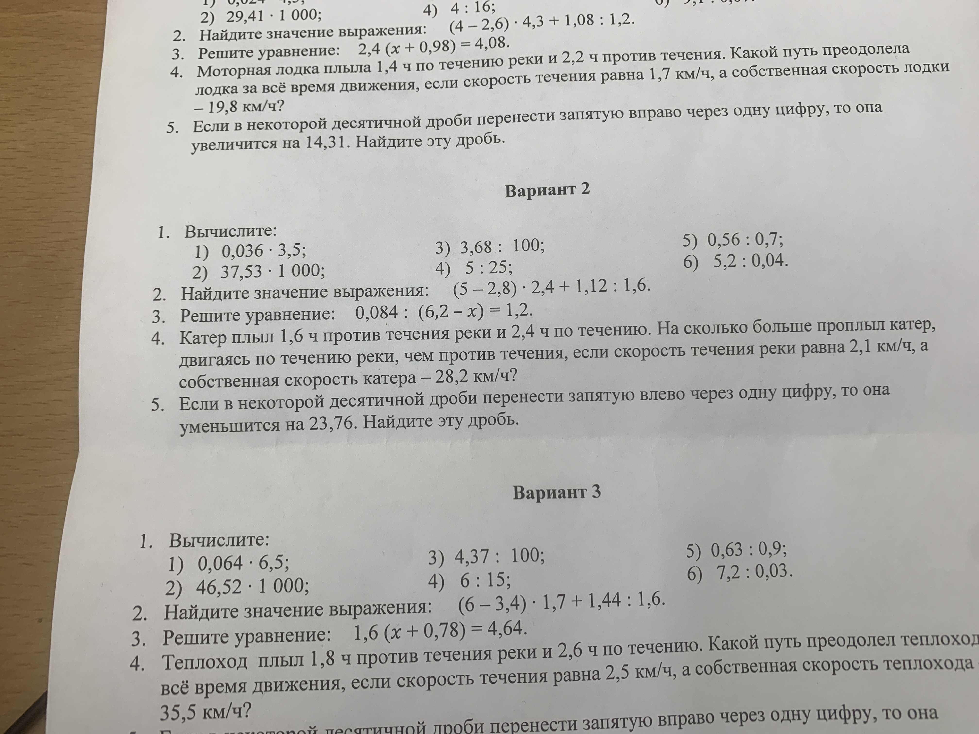 Вариант 2. Задание 1. Вычислите: 1) 0,036 * 3,5; 2) 37,53 * 1000; 3) 3,68 : 100; 4) 5 : 25; 5) 0,56 : 0,7; 6) 5,2 : 0,04.