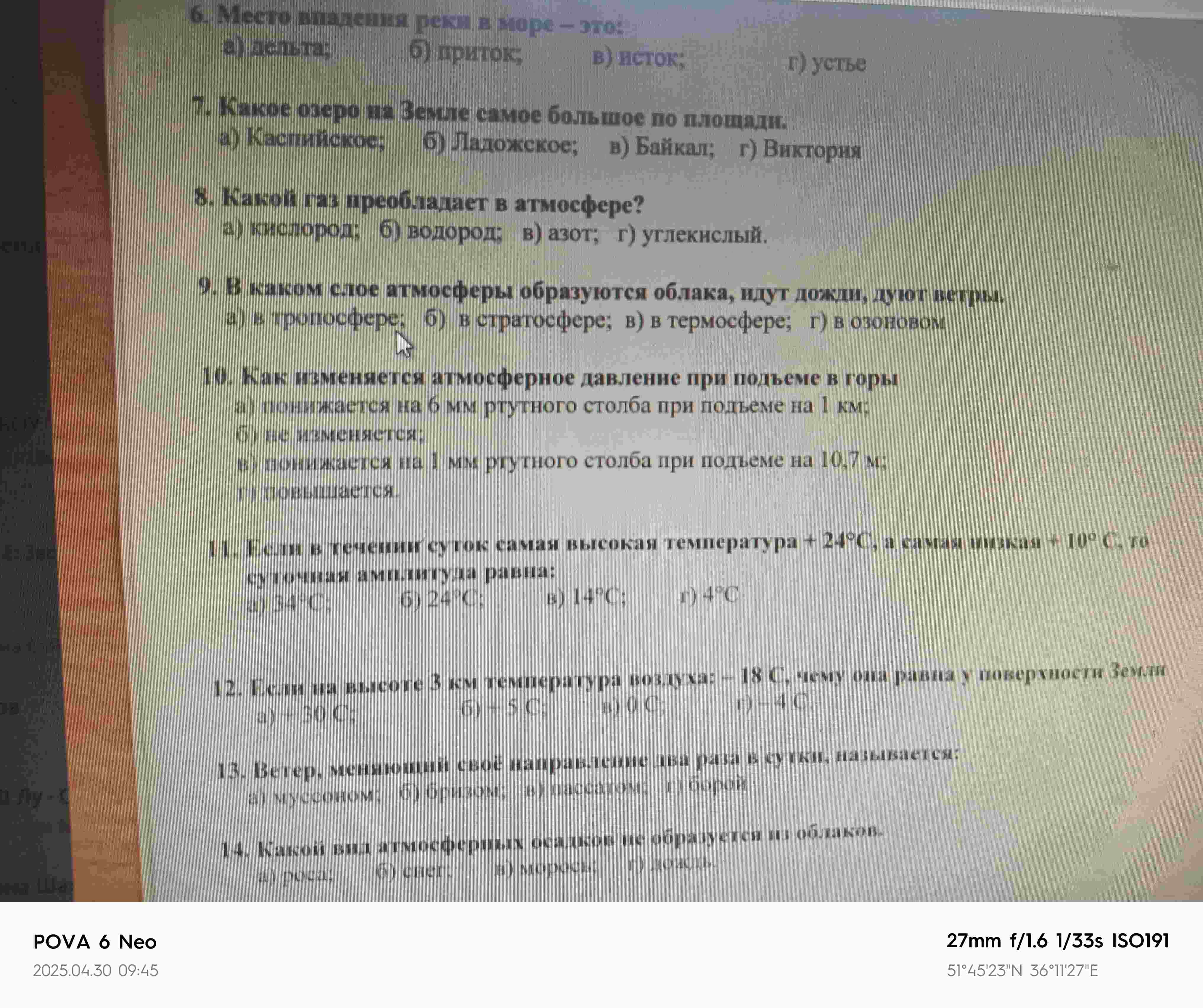 9. В каком слое атмосферы образуются облака, идут дожди, дуют ветры. а) в тропосфере; б) в стратосфере; в) в термосфере; г) в озоновом