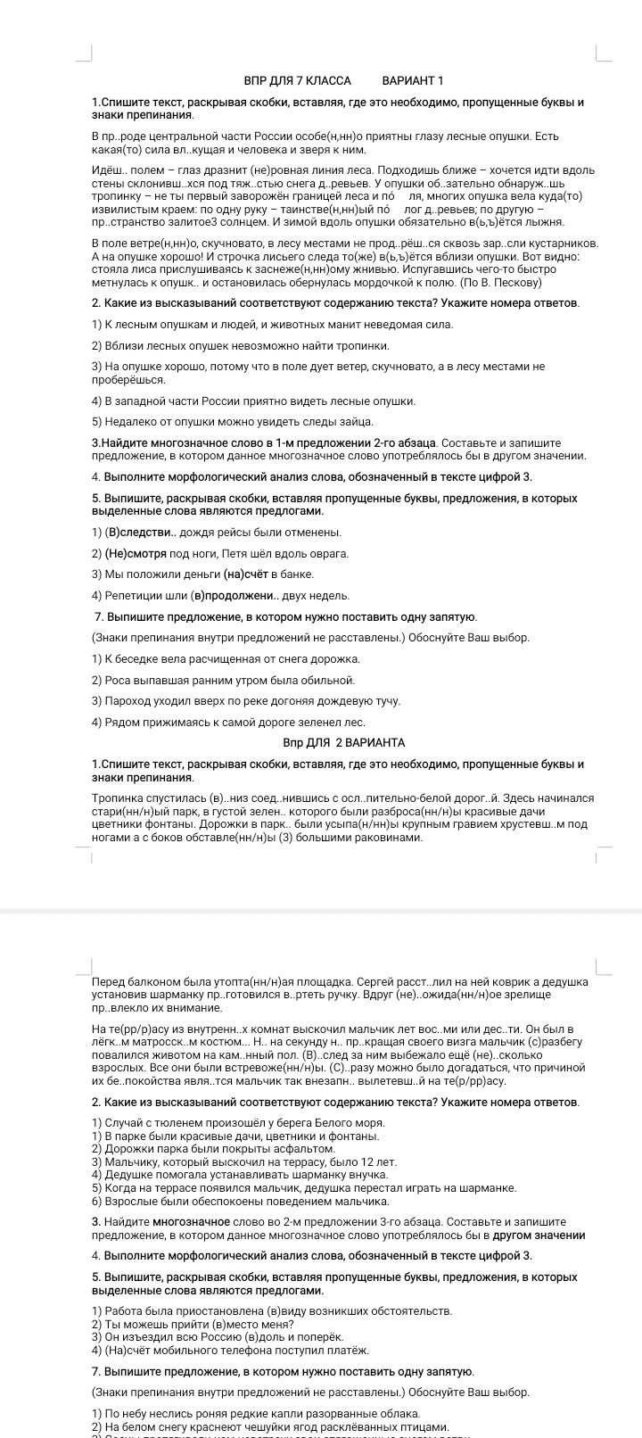 ВПР ДЛЯ 7 КЛАССА ВАРИАНТ 1. Задание 5: Выпишите, раскрывая скобки, вставляя пропущенные буквы, предложения, в которых выделенные слова являются предлогами.