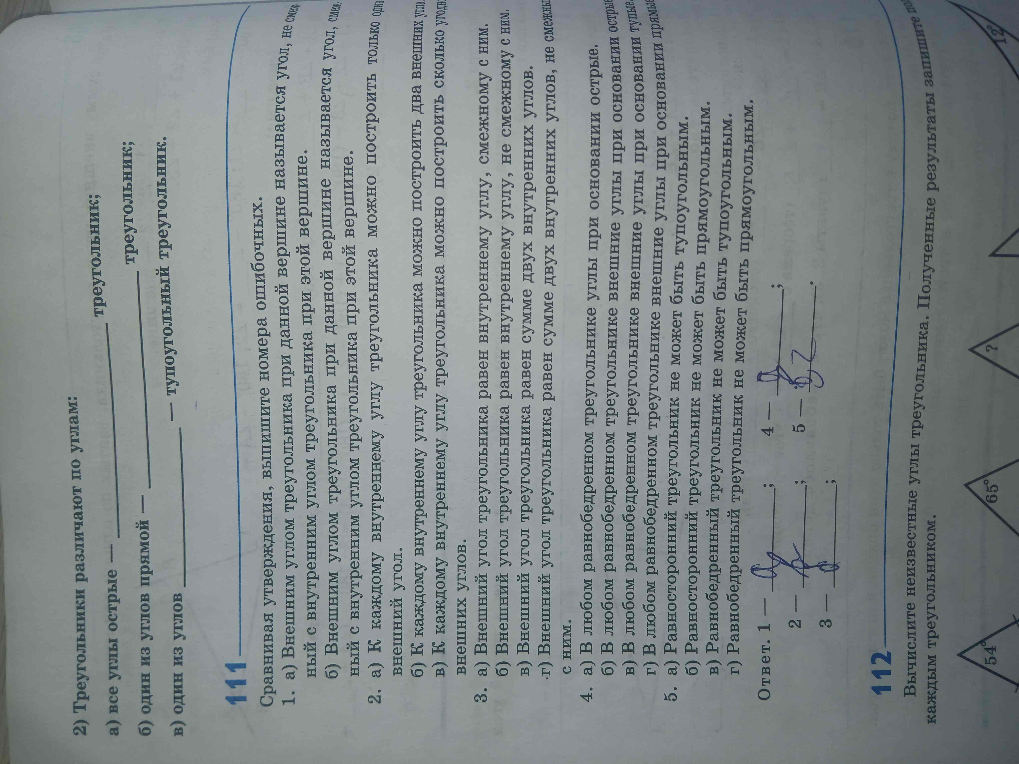 1. В первом треугольнике даны два угла: 54° и 65°. Сумма углов в треугольнике равна 180°. Обозначим неизвестный угол через x. Тогда: