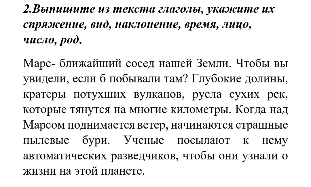 Контрольные задания > Выпишите из текста глаголы, укажите их спряжение, вид, наклонение, время, лицо, число, род.