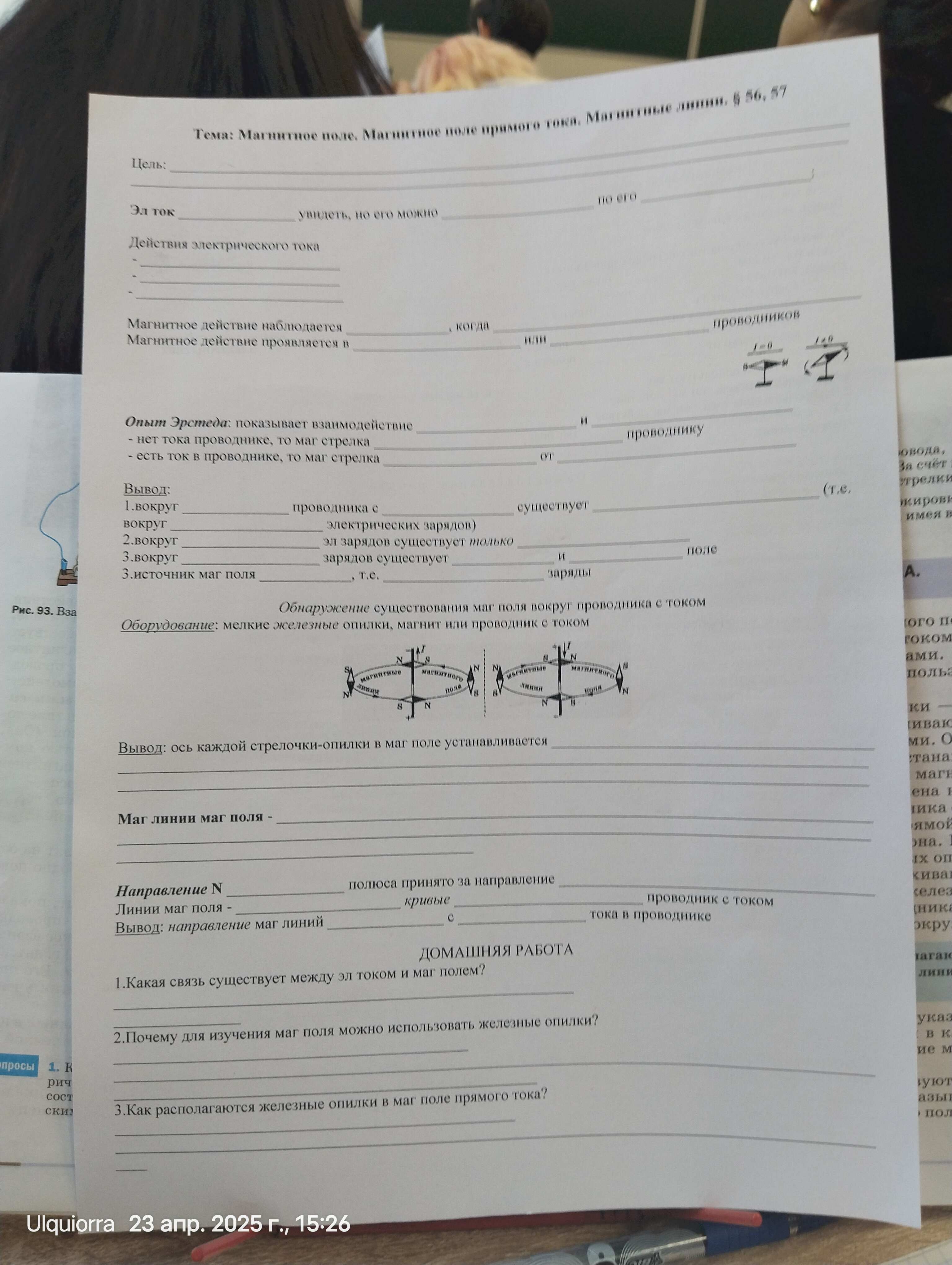 Опыт Эрстеда: показывает взаимодействие ________ и ________ проводнику нет тока в проводнике, то маг стрелка ________ есть ток в проводнике, то маг стрелка ________ от ________