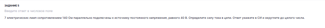 У нас есть 7 одинаковых ламп, каждая с сопротивлением 140 Ом, соединенных параллельно. Все они подключены к источнику напряжения 40 В. Наша задача - найти общий ток в цепи.