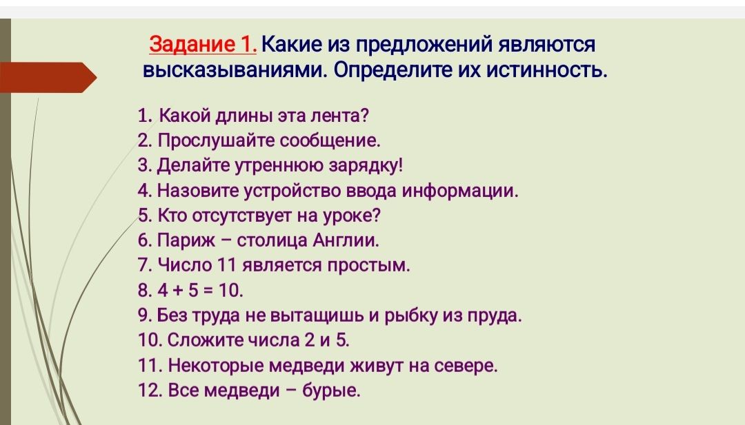 - Предложение №7 - высказывание. Оно истинное, так как число 11 является простым.