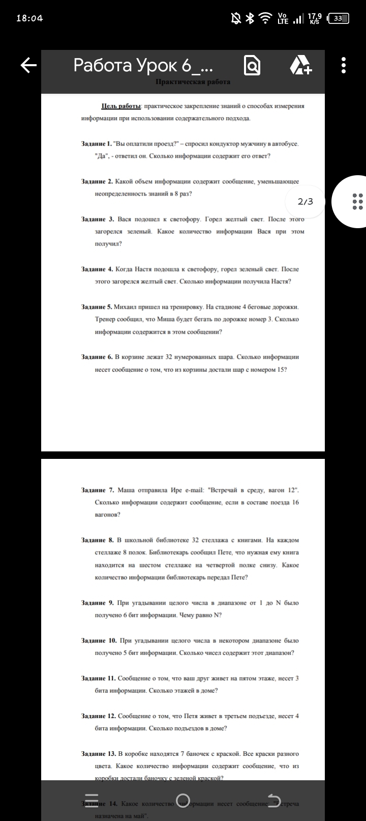 Задание 1. "Вы оплатили проезд?" спросил кондуктор мужчину в автобусе. "Да", ответил он. Сколько информации содержит его ответ?