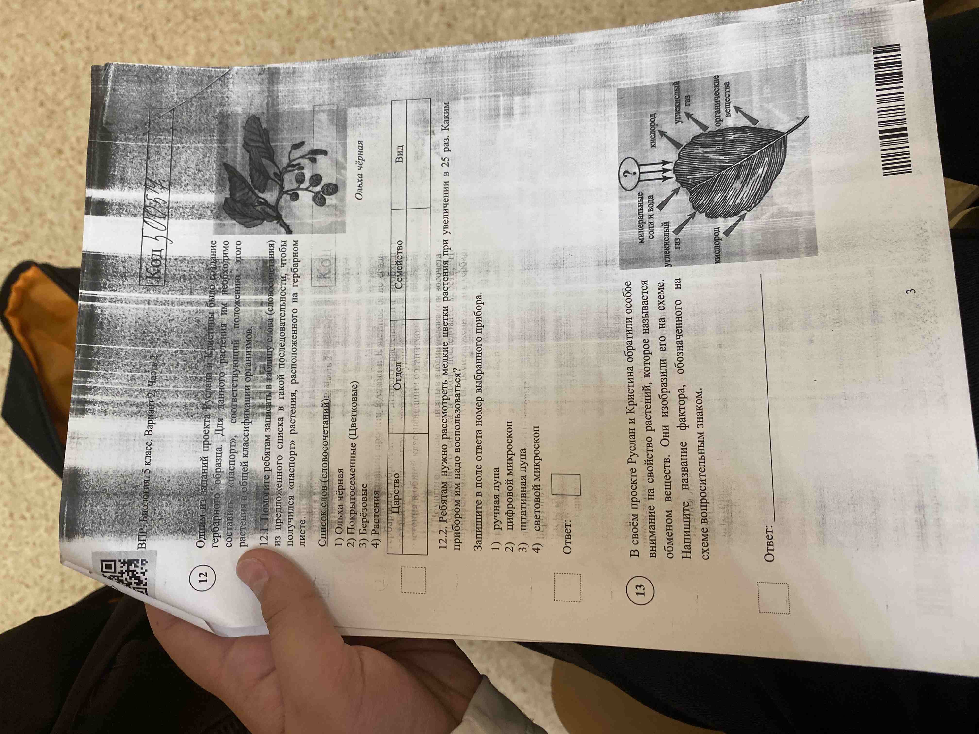 Задание 12.2: Ребятам нужно рассмотреть мелкие цветки растения при увеличении в 25 раз. Каким прибором им надо воспользоваться? 1) ручная лупа 2) цифровой микроскоп 3) штативная лупа 4) световой микроскоп