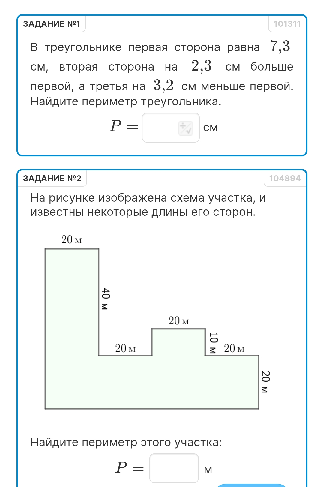 ЗАДАНИЕ №1. В треугольнике первая сторона равна 7,3 см, вторая сторона на 2,3 см больше первой, а третья на 3,2 см меньше первой. Найдите периметр треугольника.