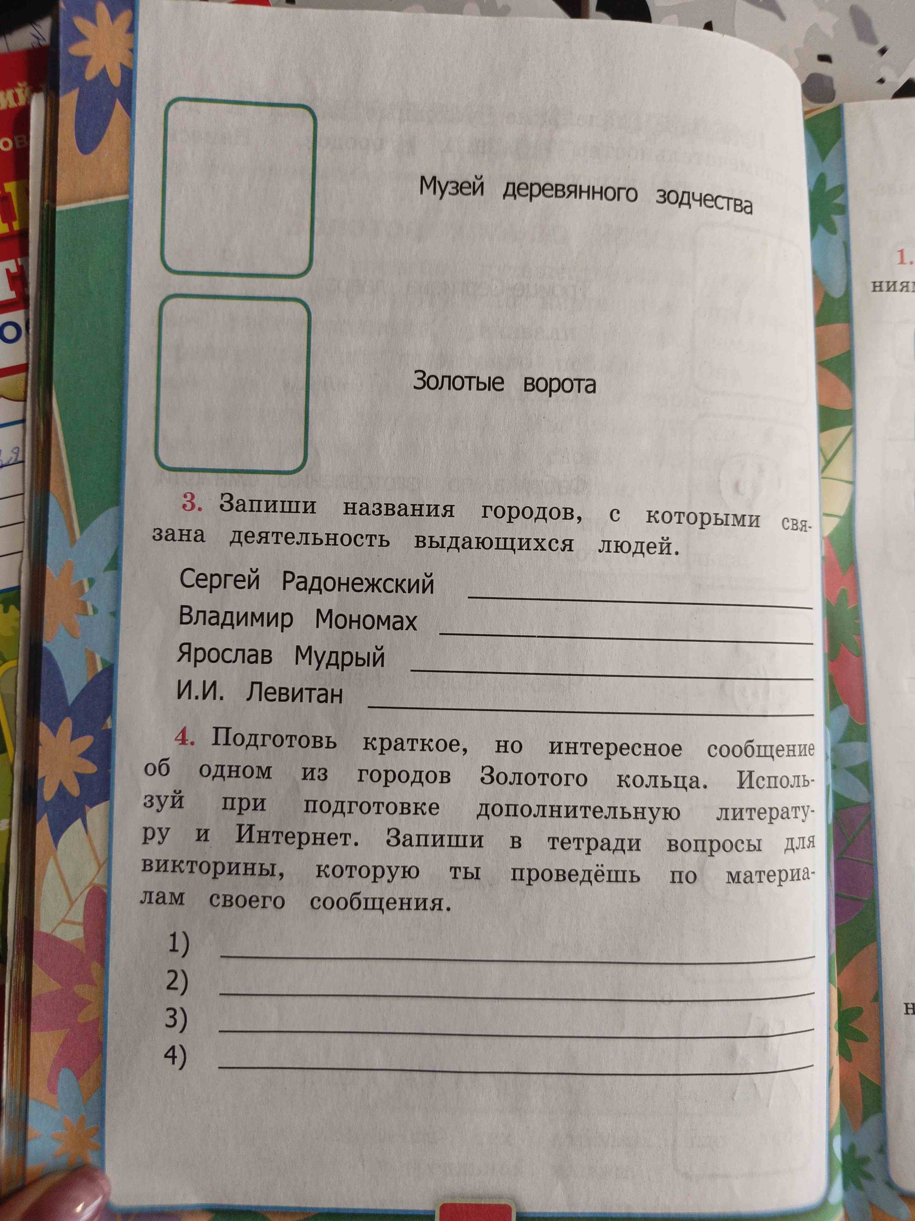 Задание 3: Запиши названия городов, с которыми связана деятельность выдающихся людей: Сергей Радонежский, Владимир Мономах, Ярослав Мудрый, И.И. Левитан.