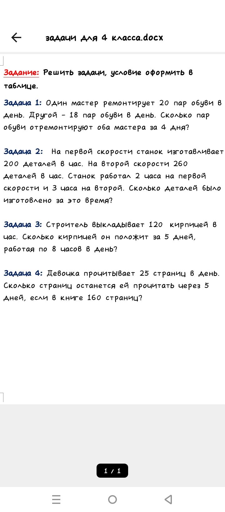 Задача 1: Один мастер ремонтирует 20 пар обуви в день. Другой – 18 пар обуви в день. Сколько пар обуви отремонтируют оба мастера за 4 дня?