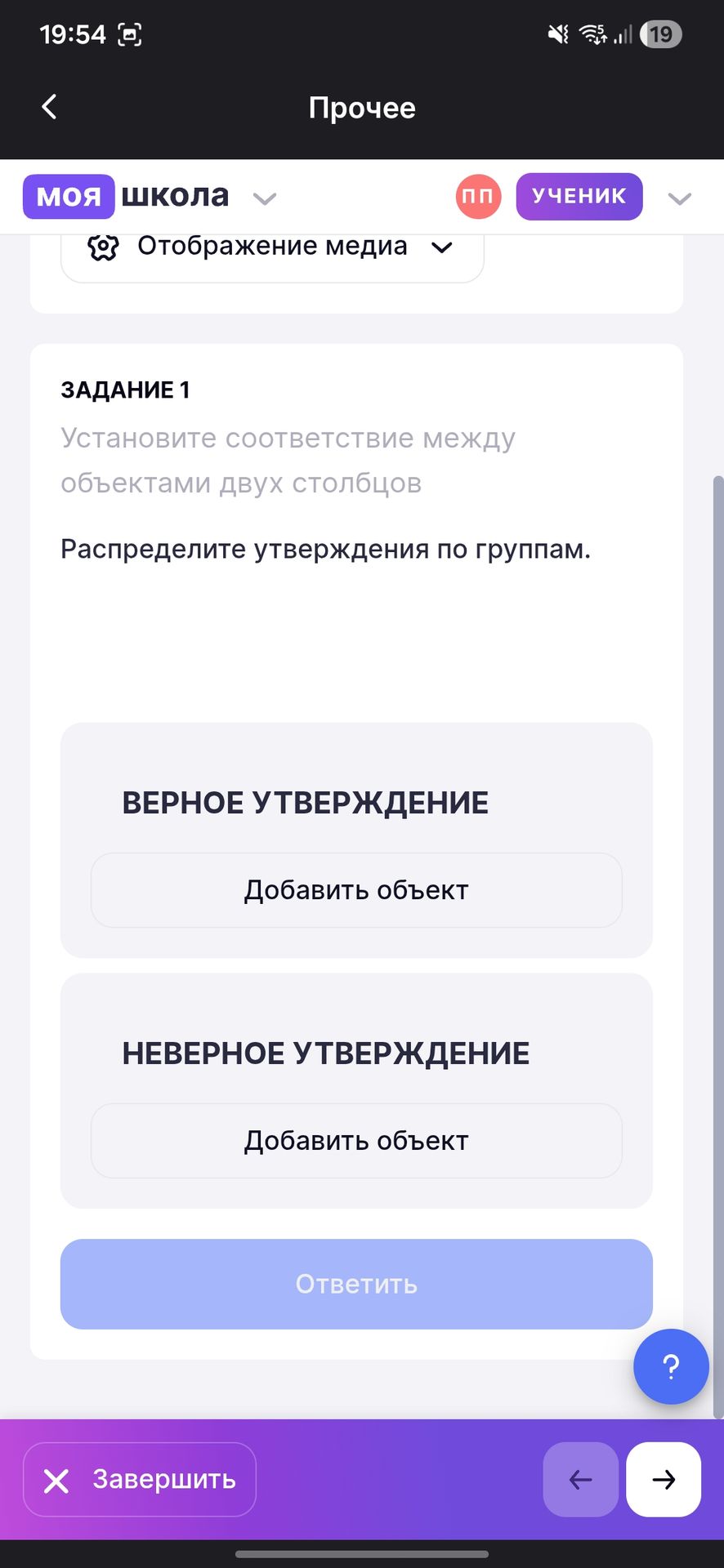 После добавления всех объектов (утверждений) необходимо нажать на кнопку "Ответить", чтобы завершить выполнение задания.
