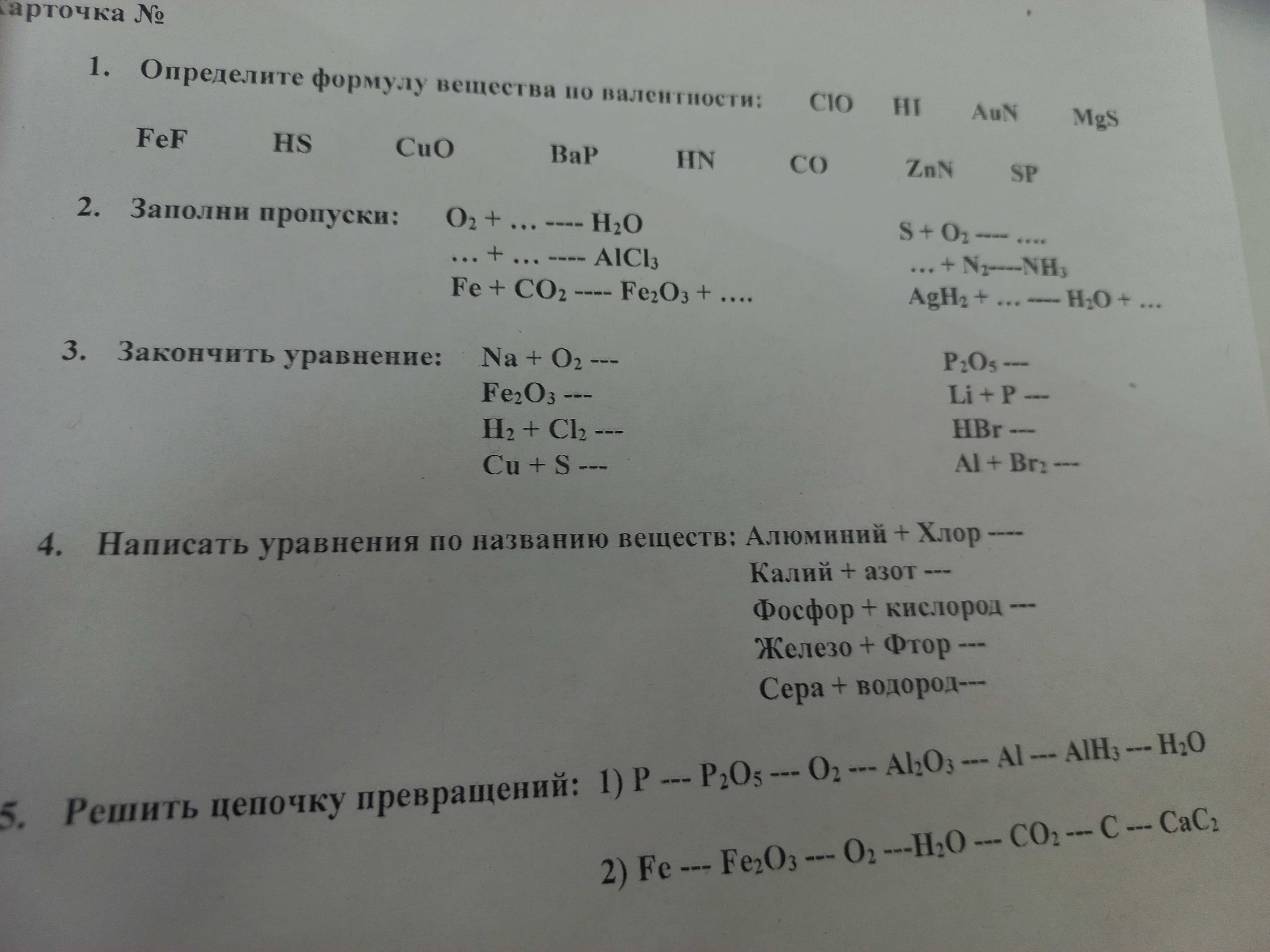Написать уравнения по названию веществ: Алюминий + Хлор, Калий + Азот, Фосфор + Кислород, Железо + Фтор, Сера + Водород.