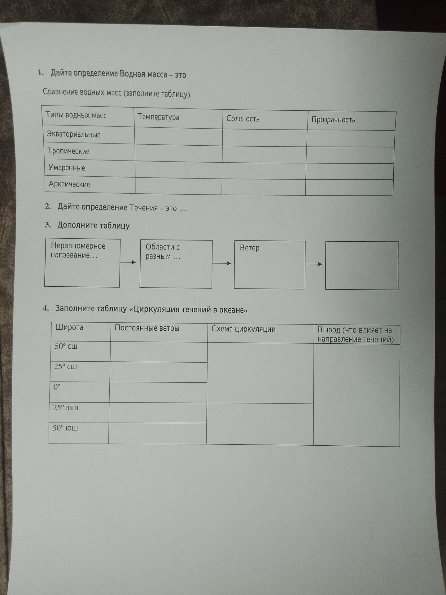 | Широта | Постоянные ветры | Схема циркуляции | Вывод (что влияет на направление течений) |